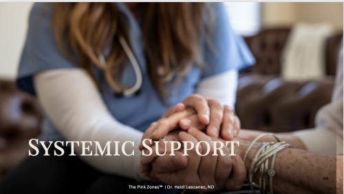 The Systemic Support Pillar of the Pink Zones calls for a shift from blaming individuals to building systems of care: policies that provide paid leave and childcare, legal protections that safeguard equity, and cultures that value care work as the foundation of community health.