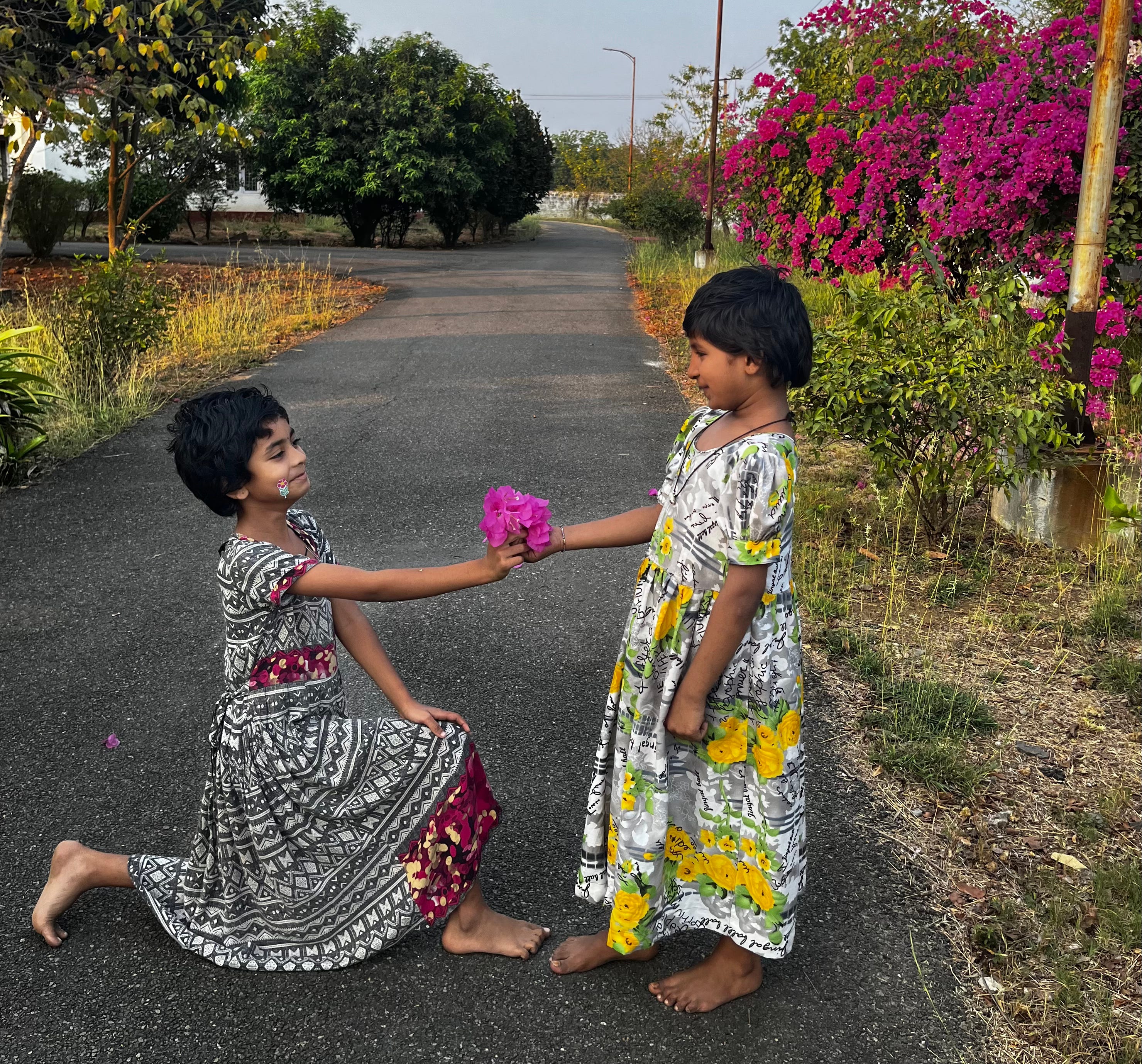 I had a tote bag with a strap that kept slipping off my shoulder. And again and again, without announcement, I would feel a small hand (often the littlest 5-7 year olds) move up my arm and gently lift the strap back into place—like someone quietly insisting: I see you. I want to help you. Then they would take my hand and quickly pull me along on the trail to pick some fruit off a nearby tree or pluck even more flowers to add to my hair or the overflowing bouquet I was already carrying. And after I received the gift, they would immediately resume holding my hand with such a delighted smile.