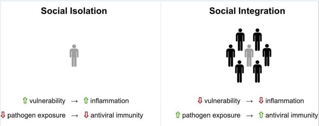 Research suggests that adverse social experiences (isolation, perceived social threat) can raise inflammatory activity while dampening antiviral defenses, while supportive social connection may do the opposite—lower inflammation and bolster antiviral responses.